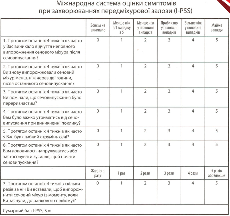 Заповніть таблицю I-PSS – міжнародна система оцінки симптомів при захворюванні передміхурової залози.